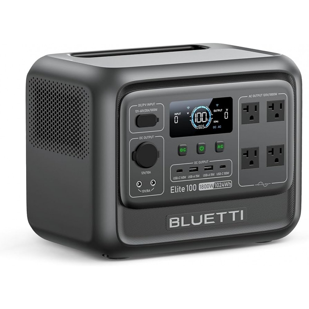 BLUETTI Elite 100 V2 — потужна портативна зарядна станція з акумулятором LiFePO₄ ємністю 1024 Вт·год та вихідною потужністю 1800 Вт. Підходить для дому, аварійного живлення, роботи, подорожей і кемпінгу.